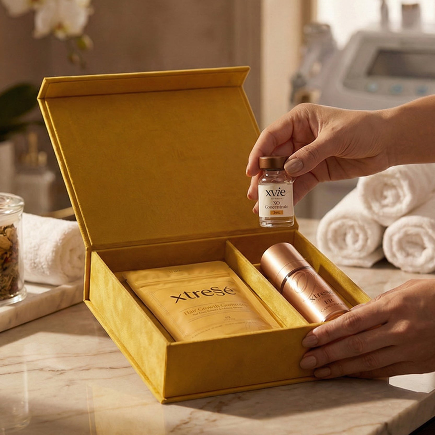 Best Results: Pair Xvie treatments with daily Hair Growth Gummies and FR Concentrate Serum for the complete stress-adaptive system — Nourish, Repair, Reactivate.